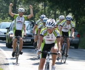 Nachdem am finalen Anstieg, dem Jauernicker Berg, die letzten Kraftreserven aus dem Körper gepresst wurden, war die Freude beim Erreichen des Ortseingangs Görlitz riesig. Claudi durfte voraus fahren, während sich die 6 Kerle gentlemenlike dahinter in 2 Dreierreihen formierten. Viele Verwandte, Freunde und Fans waren extra zum ehemaligen Burghof am Fuße der Landeskrone gekommen um die Pedaleure zu empfangen.